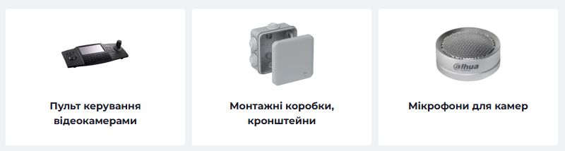 | Аксесуари та монтаж | Кронштейни, бокси IP66, мікрофони, захисні решітки | від 61 до 870 грн |