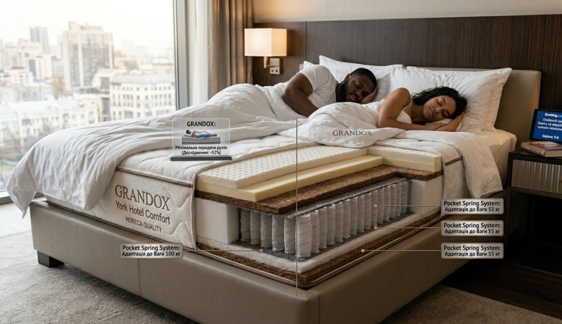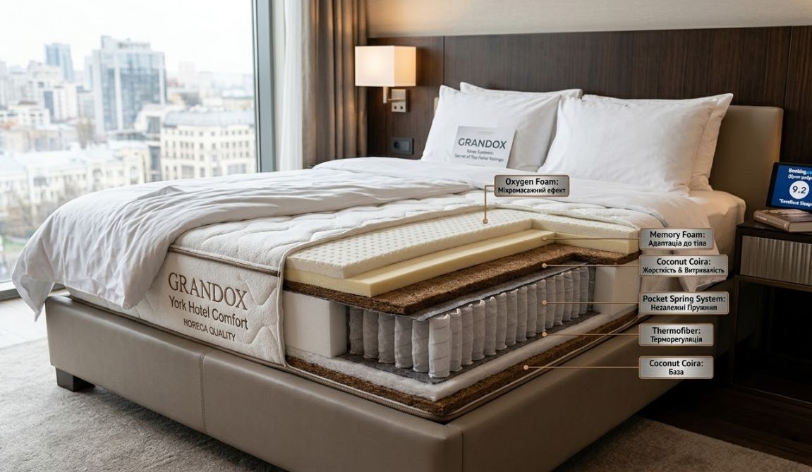 Модель GRANDOX York Hotel Comfort, наприклад, поєднує Pocket Spring, кокосову койру та багатошарові піни, що дозволяє зберігати форму навіть після 5+ років активної експлуатації.