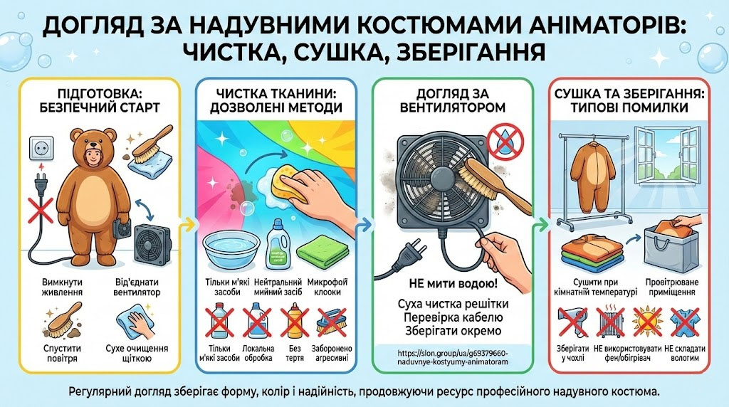 Надувні костюми для аніматорів працюють у режимі активного контакту з дітьми, підлогою, пилом і декором, тому регулярна чистка — це не «косметика», а збереження зовнішнього вигляду та ресурсу. Якщо догляд неправильний, костюм аніматора втрачає яскравість, тканина швидше зношується, а вентилятор отримує зайве навантаження. Нижче — практичні методи та засоби, які підходять для надувних костюмів на дитяче свято.